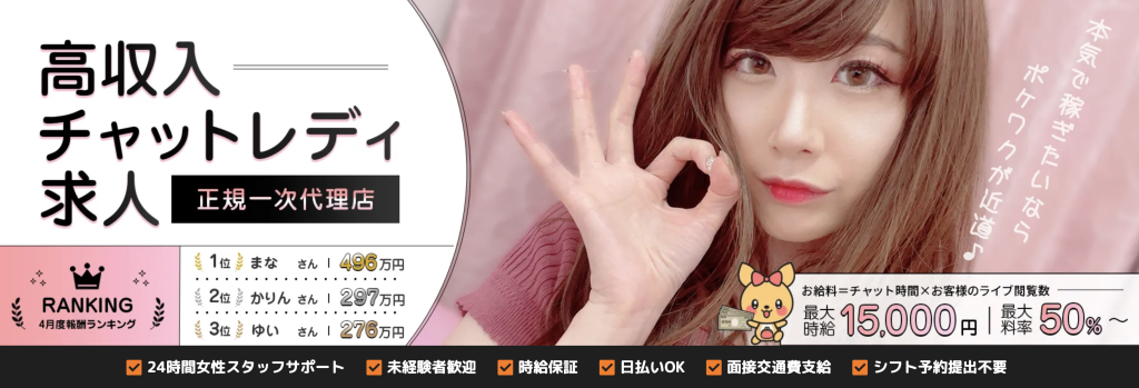 安心の国内最大手チャットレディ一次代理店。複数のサイトを掛け持ちして働きたい方や、自宅ではなく通勤で配信したい方は代理店に登録しましょう!