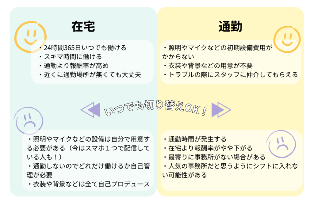 それぞれメリットデメリットはありますが、基本的にはいつでも切り替えが出来るので通勤で配信に慣れてきたら在宅に切り替えるのもおすすめです。